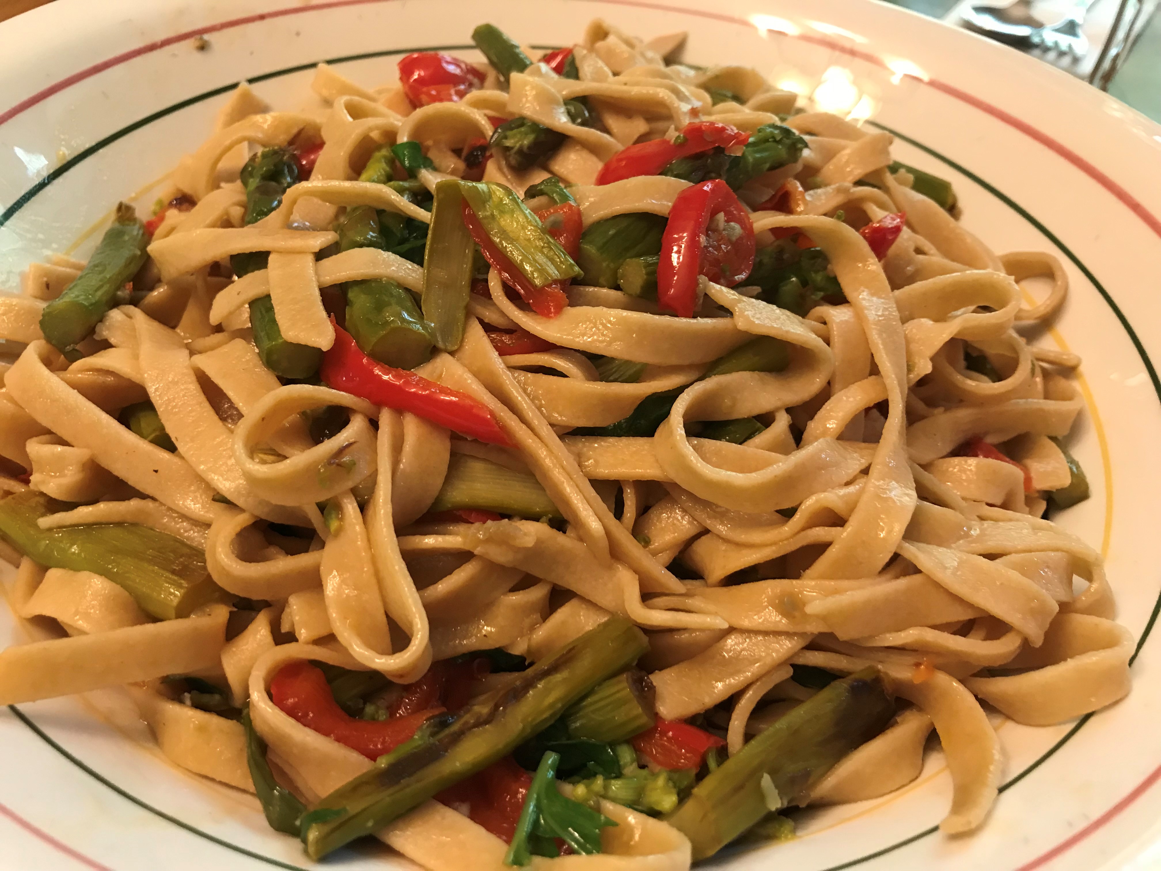 When I made whole wheat fettucine a few weeks ago, I was already imagining how it would taste with fresh asparagus, so I froze half of the pasta nests.