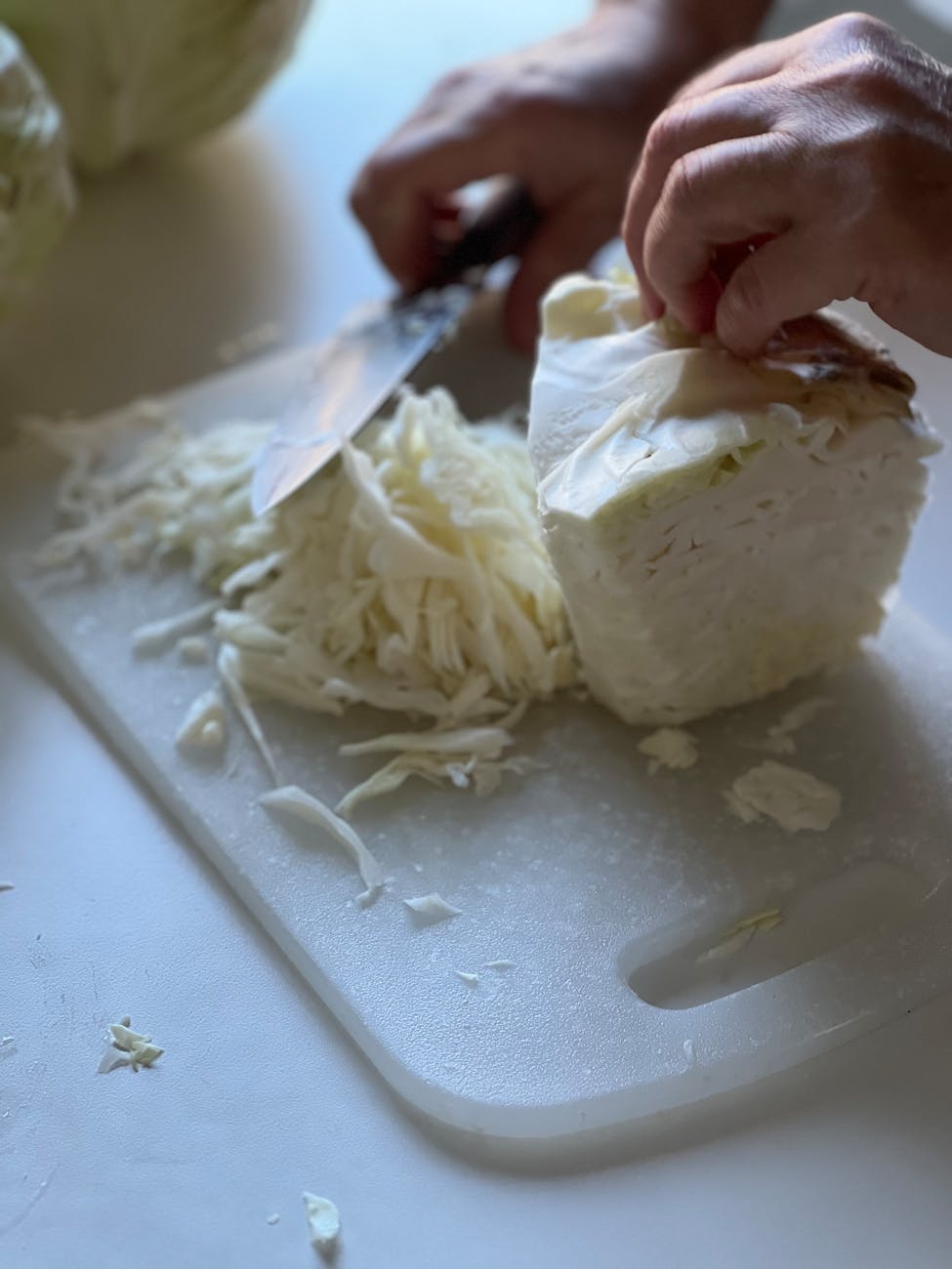 I browned the ground turkey marinated briefly in soy sauce, then added chopped onion. The next addition was cabbage, carrots, garlic and ginger. Finally, I added rice vinegar, sesame oil, hot sauce, the remaining soy sauce and black pepper. With each addition, the dish became more fragrant.